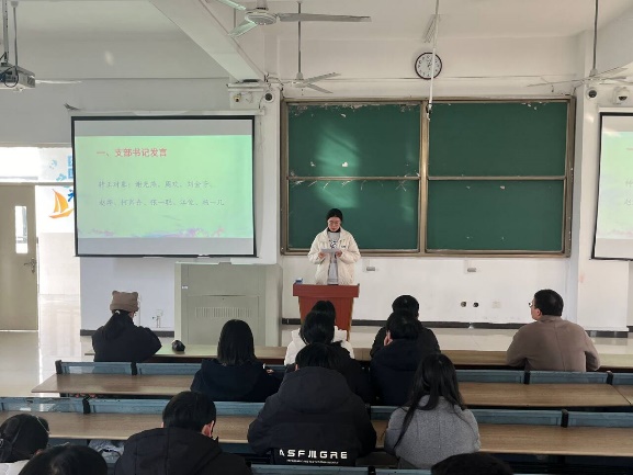 院党委副书记蔡灵美老师讲话,她向全体党员提出明确要求,强调党支部全体党员应时刻保持高度自律性,在广大同学中充分彰显党员先进性,积极发挥党员先锋模范带头作用,以实际行动为党的事业增光添彩,为同学们树立良好榜样。