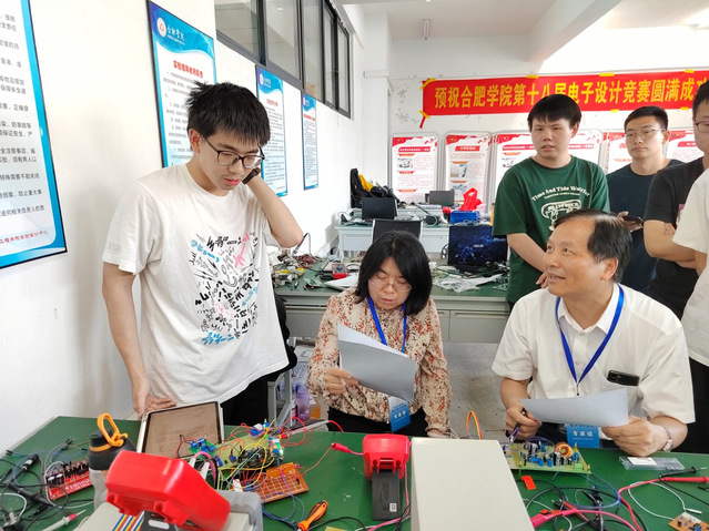 今年的合肥学院院赛已是第十八届。每一届比赛都历经笔试、预赛、决赛环节,阶段性培训贯穿始终。指导教师团队一如既往利用工作之外时间为学生指导答疑,上届学长也热心分享经验,形成了良好的传承风气。参赛选手经层层选拔和磨练,不断充实知识,提高能力,表现出了坚持不放弃的拼搏精神。在第四天的评测验收环节,评委和同学们共同探讨,发现问题和解决问题,名次不再重要,改进创新、提升工程实践能力成为最重要的收获。相信在即将到来的安徽省大学生电子设计竞赛中,我院参赛团队都能够取得满意的成绩!