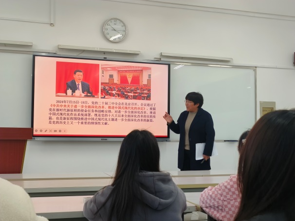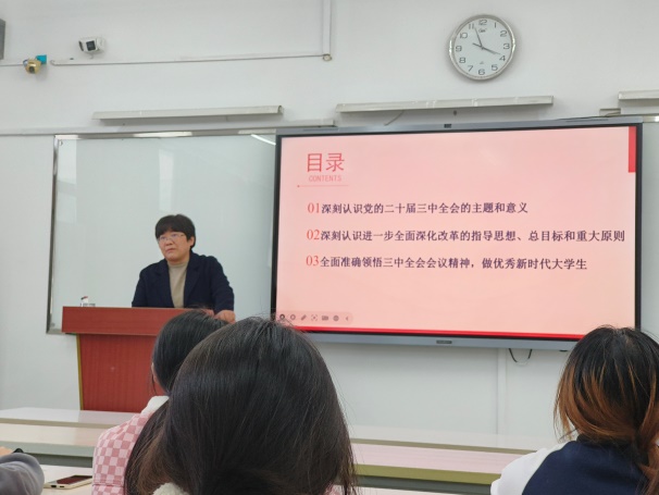 此次党课围绕二十届三中全会精神,主要从三个方面开展授课:一是深刻认识党的二十届三中全会的主题和意义;二是深刻认识进一步全面深化改革的指导思想、总目标和重大原则;三是全面准确领悟三中全会会议精神,做优秀新时代大学生。自十一届三中全会以来,我国改革开放事业全面发展,二十届三中全会更是强调要“进一步全面深化改革”。同时强调“中国式现代化”的五大特点,其既有各国现代化的共同特征更有基于自己国情的中国特色。授课过程中,李书记通过解释总书记提出的“六个力”,即思政引领力、人才竞争力、科技支撑力、民生保障力、社会协同力、国际影响力,引领支部党员用青春书写华彩篇章!
