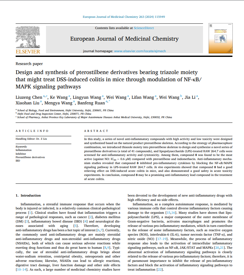 合肥学院阮班锋团队:Design and synthesis of pterostilbene derivatives bearing triazole moiety that might treat DSS-induced colitis in mice through modulation of NF-κB/MAPK signaling pathways