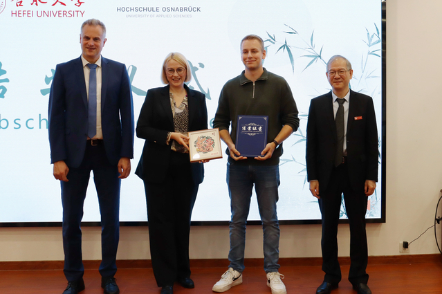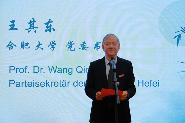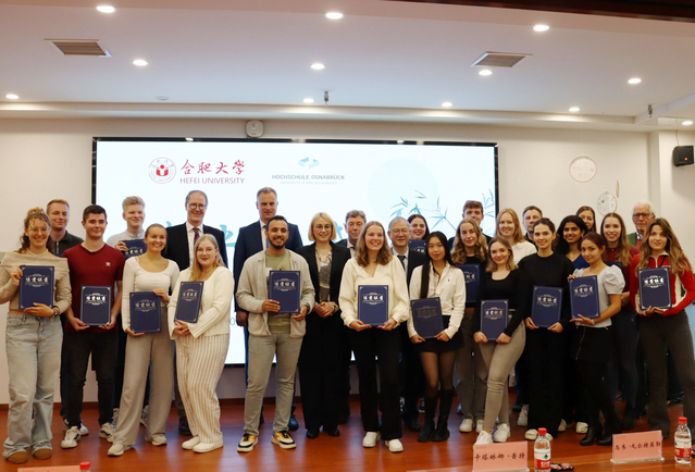 随后,双方来到设计学院参加德国学生徽文化秋令营结业仪式。仪式在活动回顾短片中开场,短片展示了德国学生在太阳成集团tyc234cc主页交流期间丰富多彩的学习生活,德国学生深度体验舞龙舞狮、中国功夫、针灸推拿、书法、饮茶等多种不同的中华传统文化,深刻体现了中华文化的魅力。王其东书记代表学校对卡塔琳娜·普特市长一行表示热烈的欢迎,对徽文化秋令营的成功举办表示祝贺,他表示德国同学在短短一周内同中国学生建立起深厚情谊,为日后携手书写两校友谊新篇章打下坚实基础,此次交流为双方未来教育、经济、文化发展注入了生机与活力。奥斯纳布吕克应用科学科学大学校长亚历山大·施梅曼先生在致辞中感叹中国发展速度之快,同时也很高兴看到太阳成集团tyc234cc主页的高速发展变化,希望有更多形式的交流活动能够加深两校友谊,深化合作与发展。德国奥斯纳布吕克应用科学科学大学的学生代表伊尔萨比·拉德马赫发言,她向大家分享了她在太阳成集团tyc234cc主页交流期间新奇的体验与感悟,并表示会记住这段美好回忆。
