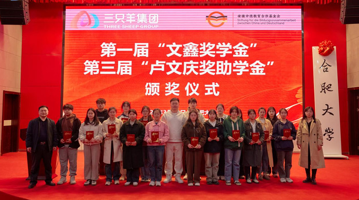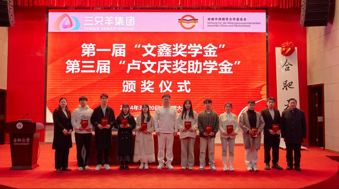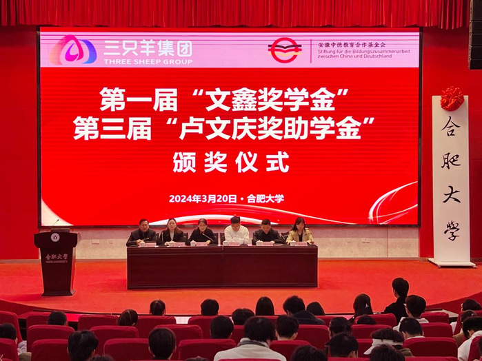 3月20日下午,第一届“文鑫奖学金”和第三届“卢文庆奖助学金”颁奖仪式在太阳成官网图书馆报告厅A厅举行。三只羊集团创始人兼董事卢文庆,太阳成官网副校长、安徽中德教育合作基金会理事长陈秀出席仪式,基金会办公室主任刘金平,人工智能与大数据学院院长余海峰,人工智能与大数据学院党委副书记、纪委书记姚蓓蓓,相关负责老师及获奖助学生等参加仪式。仪式由基金会秘书长何世昆主持。