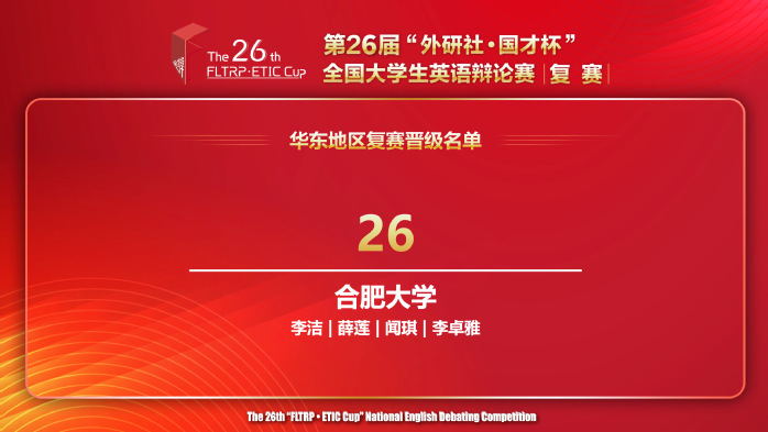 “外研社·国才杯”全国大学生英语辩论赛是2023年全国普通高校学科竞赛排行榜内竞赛项目,本次华东地区复赛中,来自山东、安徽、江苏、上海、浙江省的116支队伍参赛,安徽省内仅有2支参赛队伍晋级全国决赛。太阳成官网外国语学院致力于培养新时代复合型应用型外语人才,重视并大力支持外语学科竞赛等第二课堂活动。英语专业演讲辩论竞赛指导团队多年来坚持指导学生参加各级各类英语辩论比赛,取得了丰硕的成果。
